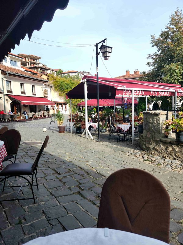 Located opposite St Sofia Church, it is a very nice place in terms of its location. I can't remember the name but the pizza made with pork was very tasty. You can order wine or beer with it. I think the pizza is around 600MKD for 1 medium size. Be sure to stop by for a short break. It was empty when we went there but it gets quite crowded during the season and if you can't find a place here, the alternative to this restaurant is Pizza Nemo. If you also want to try the local delicacy "pastrmajlija", the best place in Ohrid is Pizza Via Sacra. Number 1 on the map