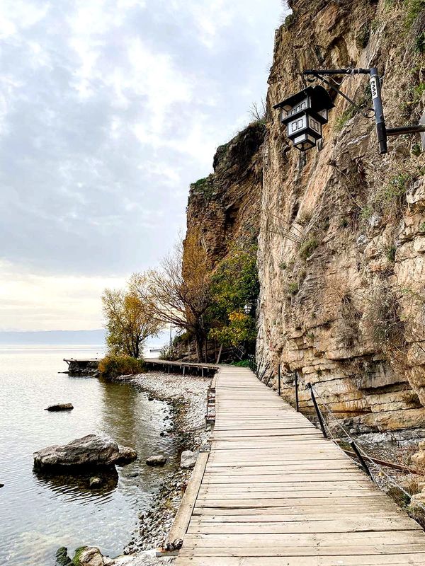 The wooden bridge running parallel to the shore of lake ohrid. i think it is also called the bridge of love. i marked it as a walking icon on the map. The end of the bridge extends to the small chapel. also if you are going in the summer season and want to swim in the lake, you can take a look at the places I have marked as beaches.